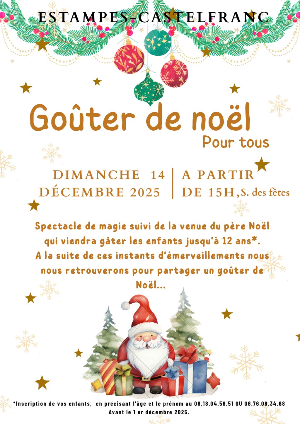Noël approche à grand pas et nous avons décidé d'amener un peu de magie dans notre village. Nous vous attendons pour un après-midi chaleureux avec spectacle, venue du père noël pour les enfants et moment convivial autour d'un gouter pour tous les Estampais et Estampaises!