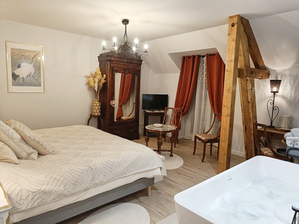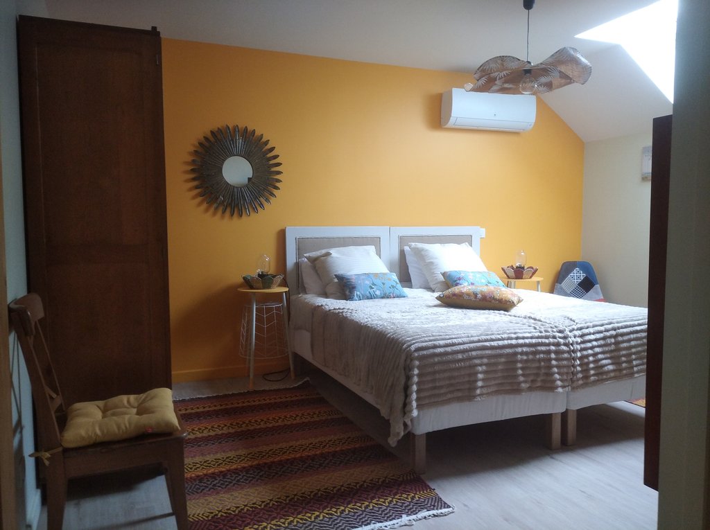Ouverte depuis fin décembre, notre Maison d'hôtes labellisée par Gîtes de France Allier vous propose 3 grandes chambres entièrement neuves(4 Épis) situées dans l'ancien grenier à foin de la maison fermière : la chambre Mésange et son lit double de 160/200cm,
