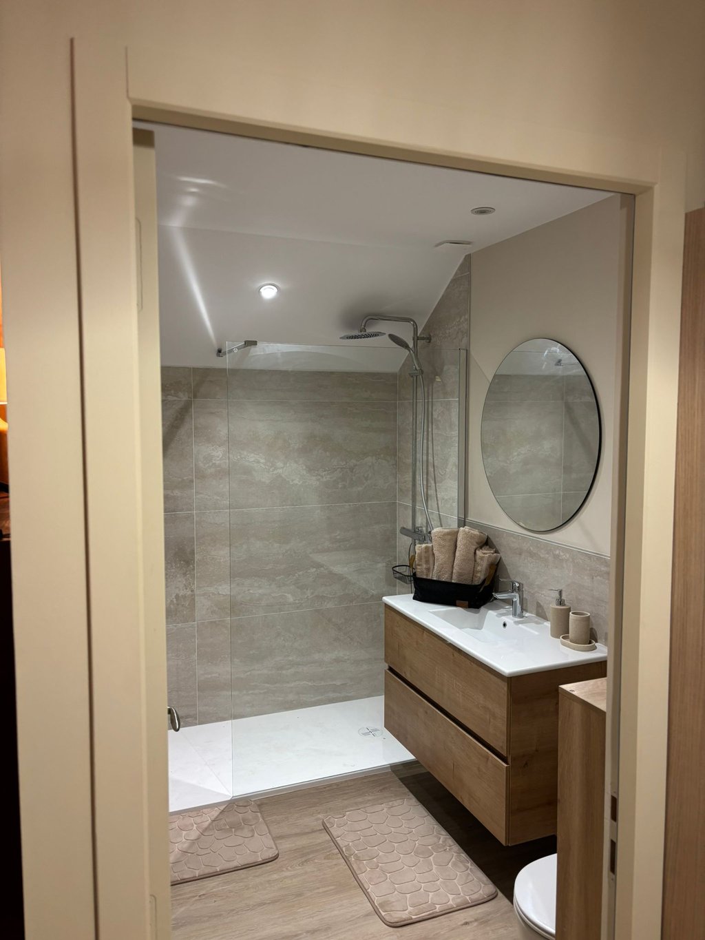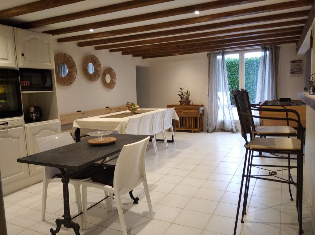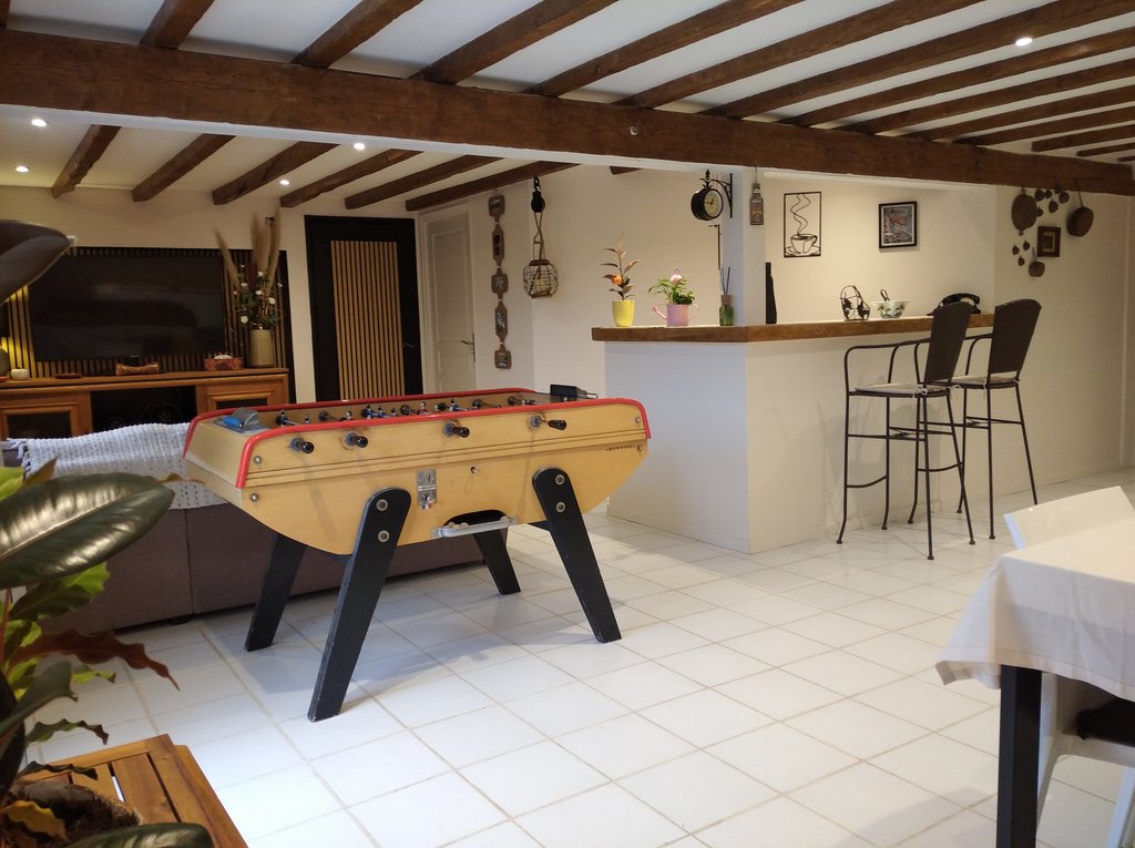 Au rez-de-chaussée, une vaste pièce de vie avec cuisine équipée et un salon TV avec son bar et son babyfoot vous permettra de déguster nos copieux petits-déjeuners faits maison avec des produits de la région, à moins que vous ne préfériez être sur la terrasse privative pour profiter du soleil matinal.