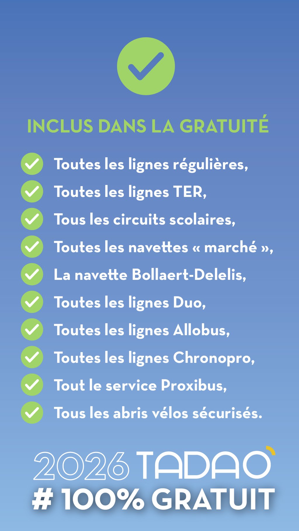 Dès le 1er janvier 2026, vous pouvez monter dans un bus TADAO sans aucun titre de transport ni abonnement. Le réseau TADAO devient entièrement gratuit. Que vous soyez habitants du territoire ou simple visiteur de passage, vous montez et descendez où bon vous semble aussi souvent que cela vous chante.