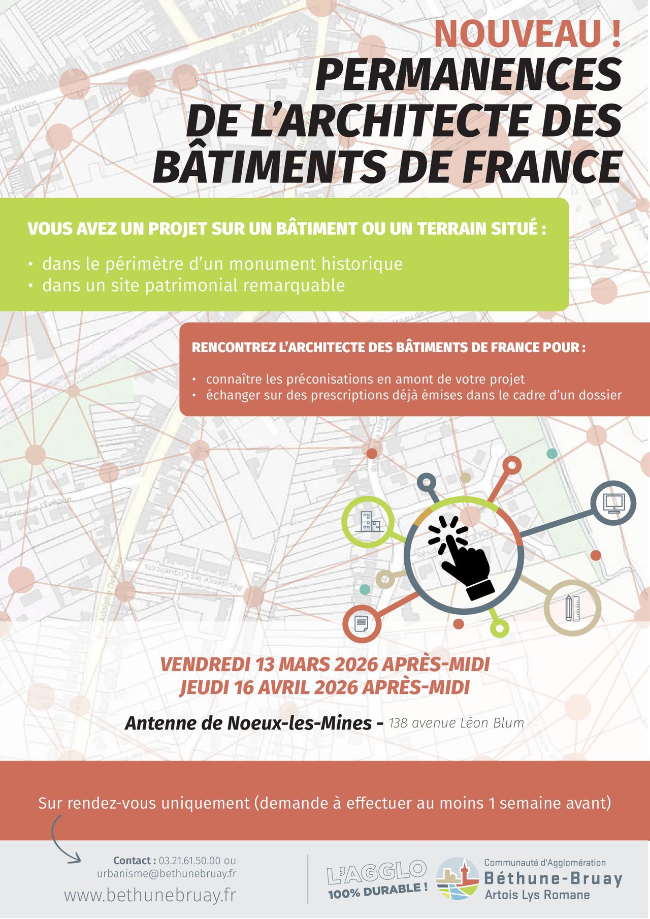 03 21 61 50 00 ou urbanisme@bethunebruay.fr qui lui proposera un horaire de rendez-vous.