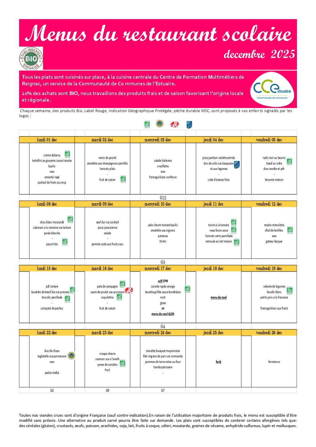 Menus du mois de décembre préparés par le CFM de Reignac 😊
