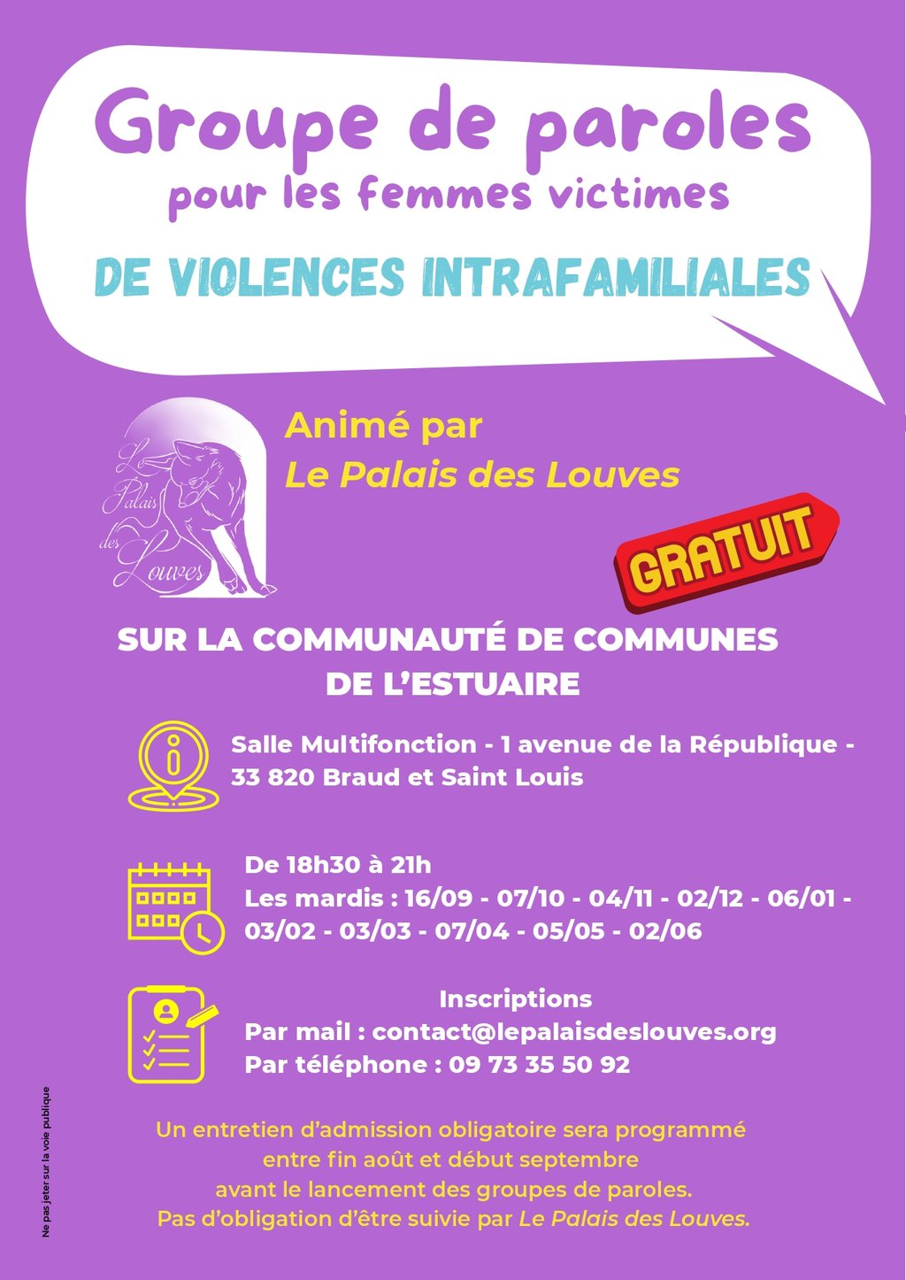 De septembre 2025 à juin 2026, le Palais des Louves organise des groupes de parole dans les 4 Communautés de Communes de la Haute Gironde.