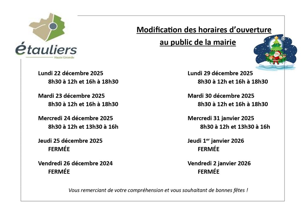 Horaires de la mairie pendant la période des fêtes de fin d'année