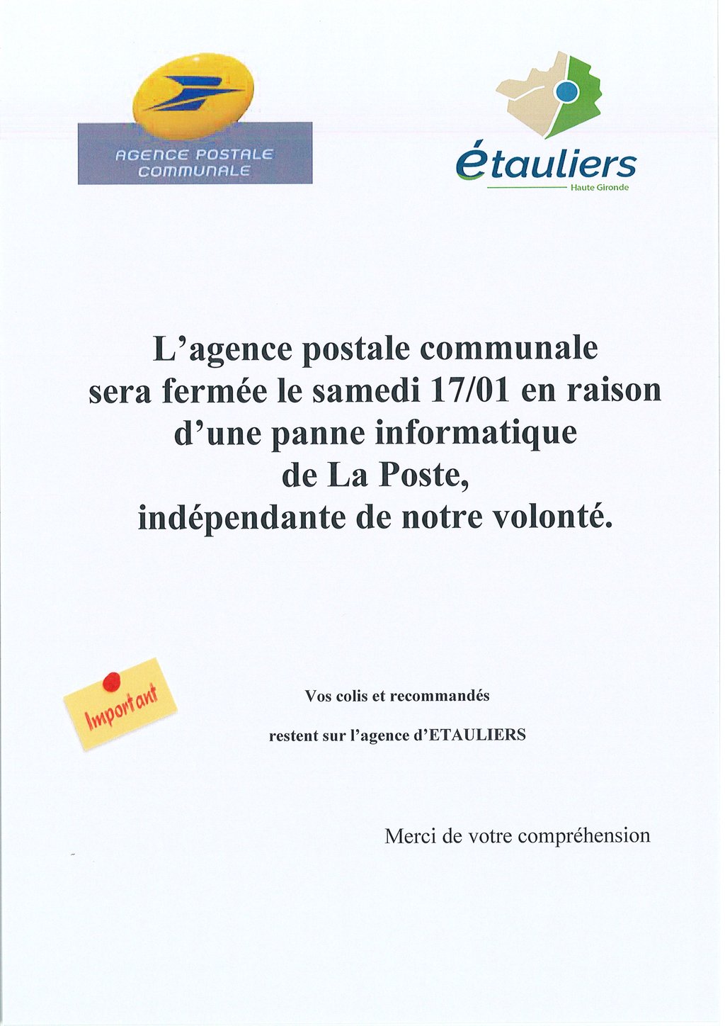 FERMETURE SAMEDI 17 JANVIER 2026 - AGENCE POSTALE