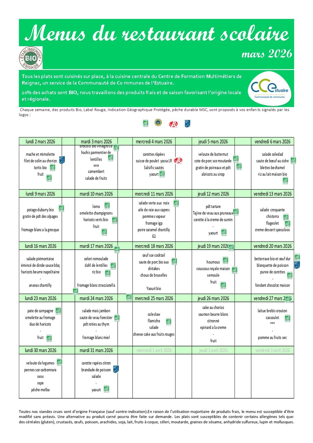 MENUS DES ÉCOLES DU MOIS DE MARS 2026