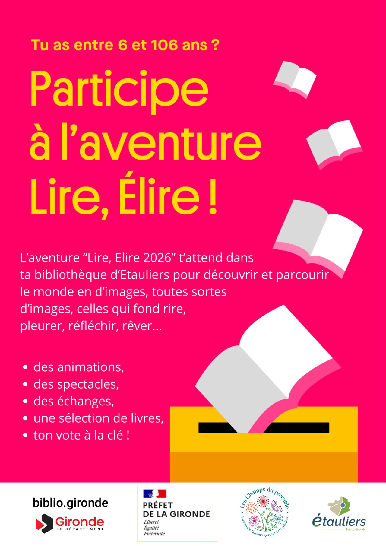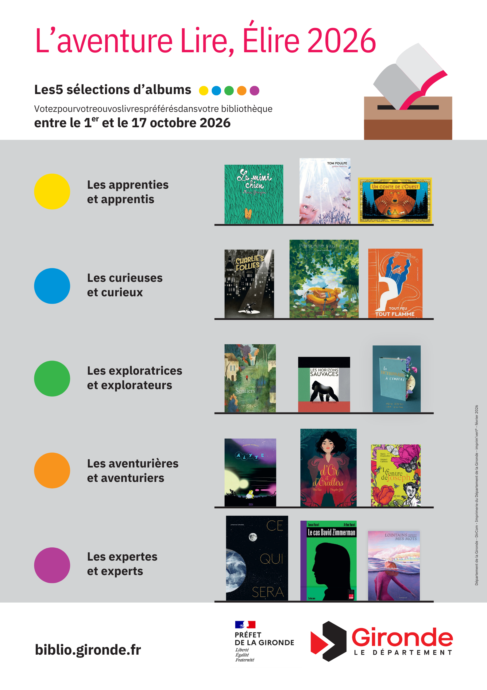 - Voter pour son livre préféré, dans une ou plusieurs sélections (entre le 1er et le 17 octobre 2026, à la bibliothèque)