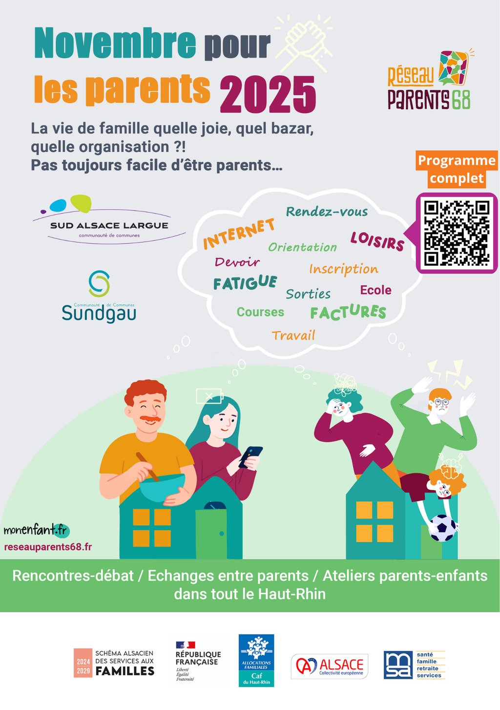 đTout au long du mois de novembre, le RĂ©seau Parents 68, ses partenaires et les CommunautĂ©s de communes Sundgau et Sud Alsace Largue vous proposent un festival dâidĂ©es pour mieux vivre la vie de familleđdes rencontres entre parents, des ateliers, des confĂ©rences avec des professionnels et des journĂ©es Ă partager en famille !..