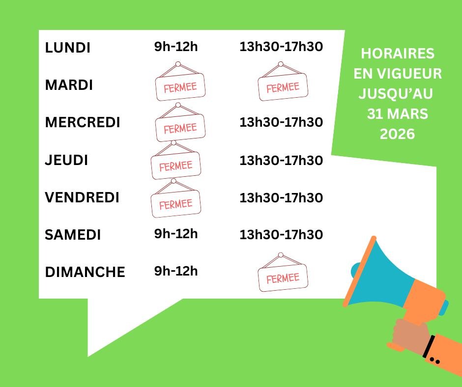 Quelques modifications cette année par rapport aux précédents horaires en vigueur : journée de fermeture le mardi, uniformisation des horaires le matin, ouverture dès 13h30 l’après-midi.