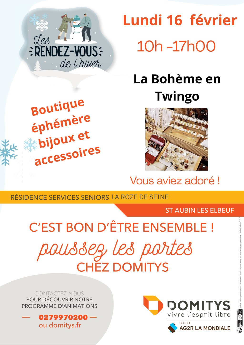 Nouvelle boutique éphémère au sein de la résidence Domitys "La Roze de Seine", La Bohème en Twingo sera présente pour vous présenter ses bijoux et accessoires, le lundi 16 février de 10h à 17h.