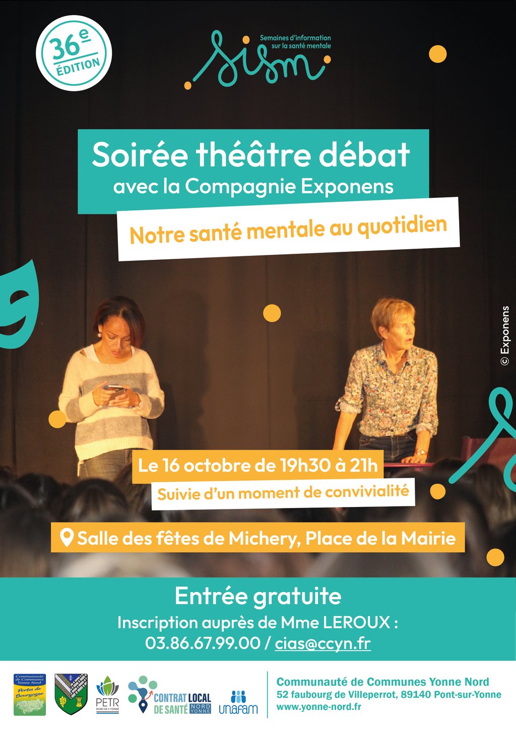 Rendez-vous jeudi 16 octobre de 19h30 à 21h à la salle des fêtes de Michery pour une soirée théâtre-débat animée par la Compagnie Exponens, sur le thème : Notre santé mentale au quotidien