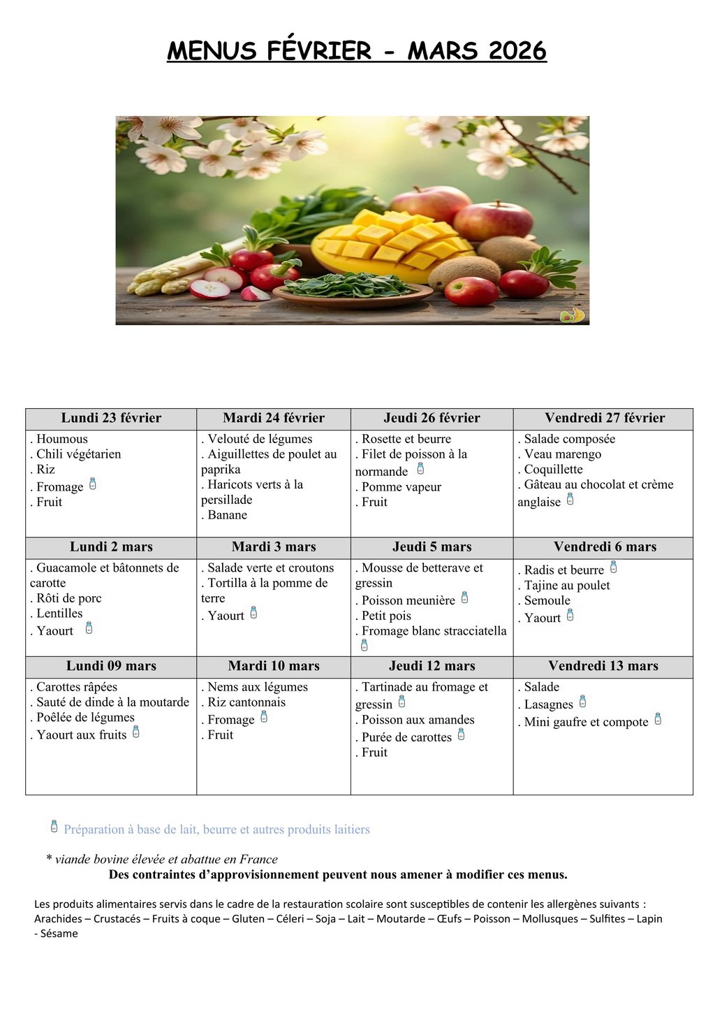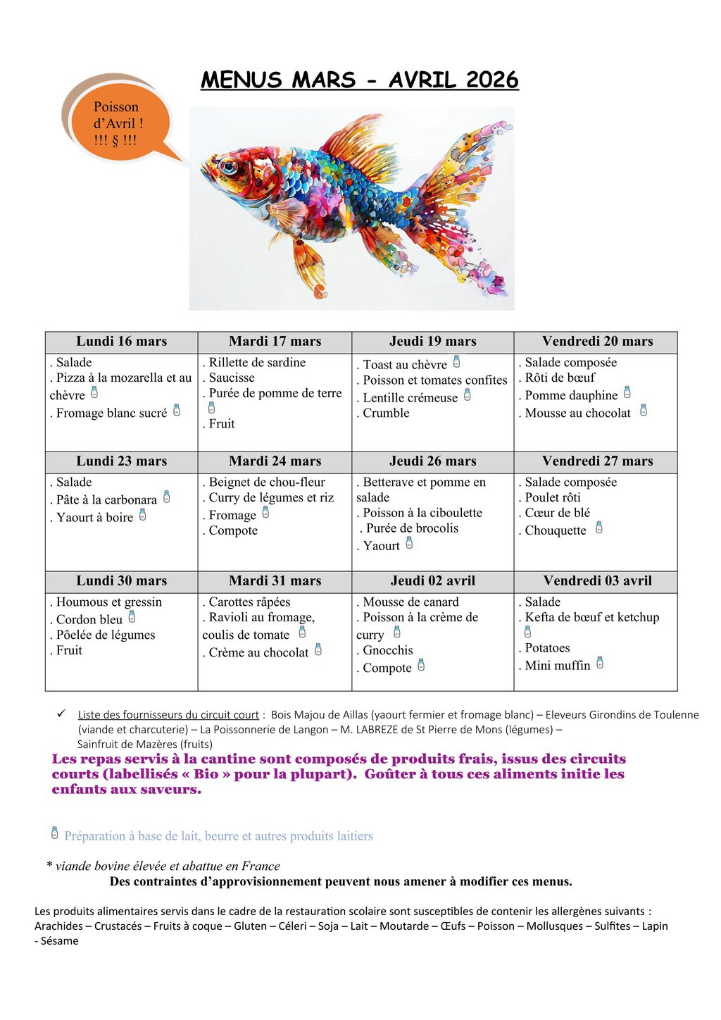 Menus du cycle 4 - Période Mars et Avril 2026.