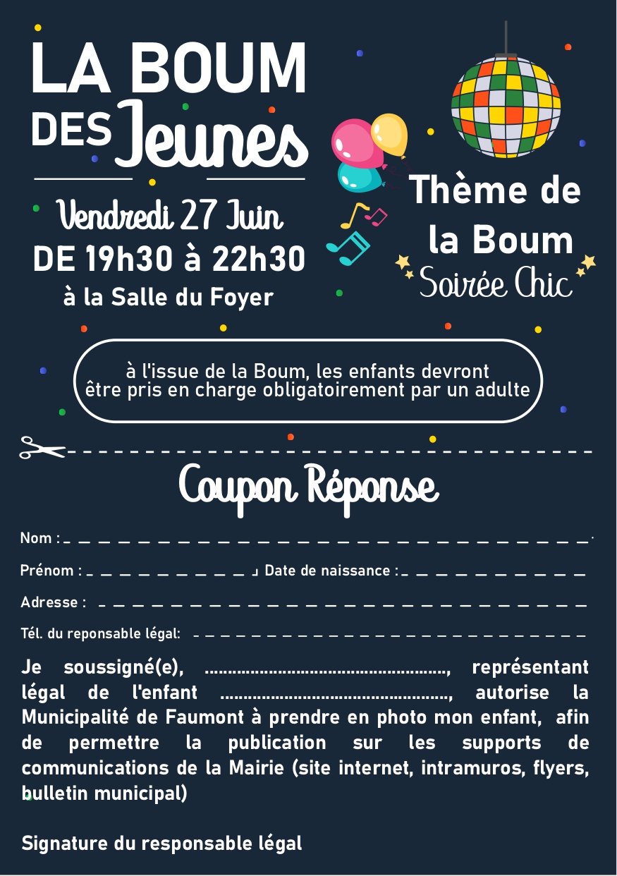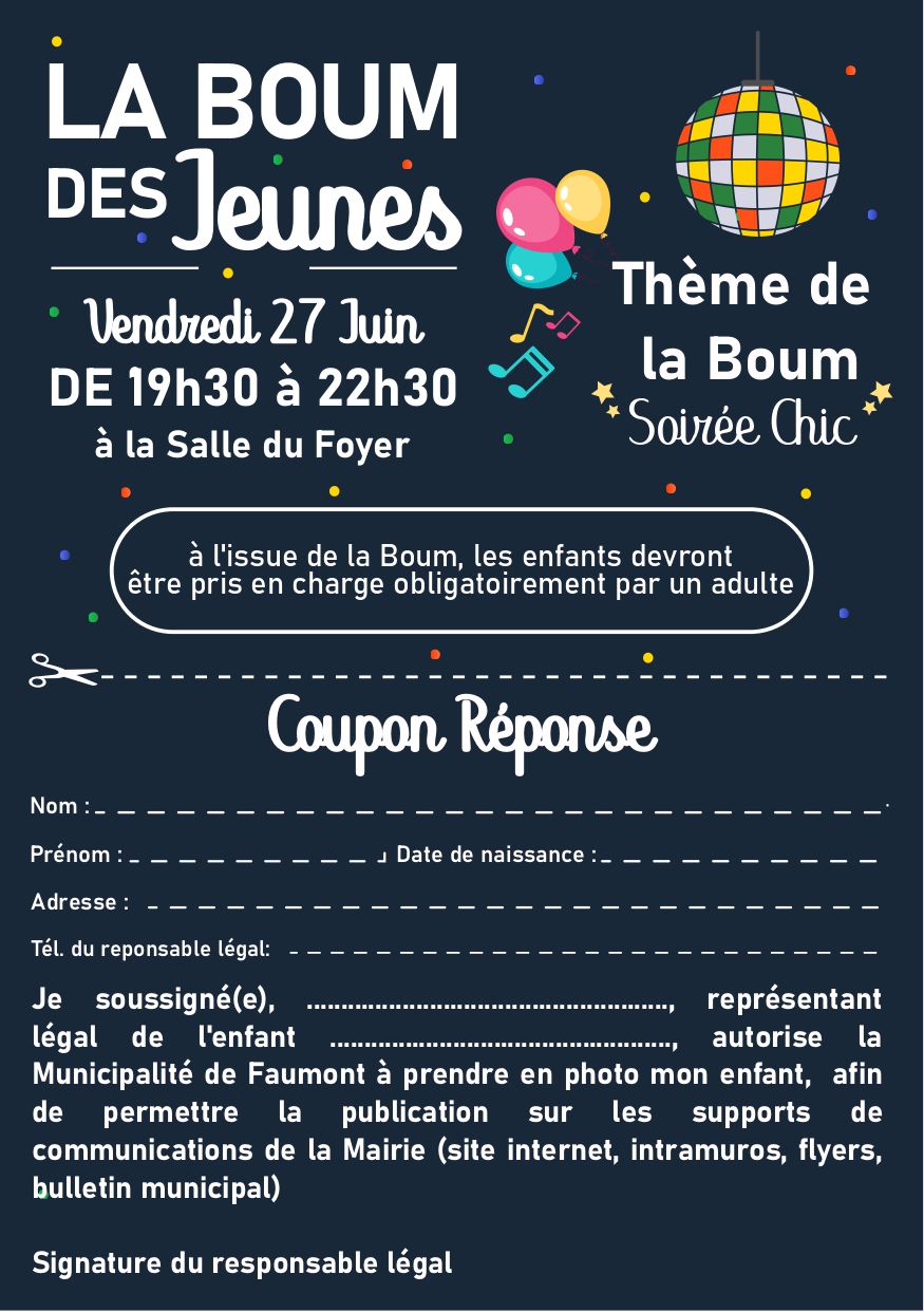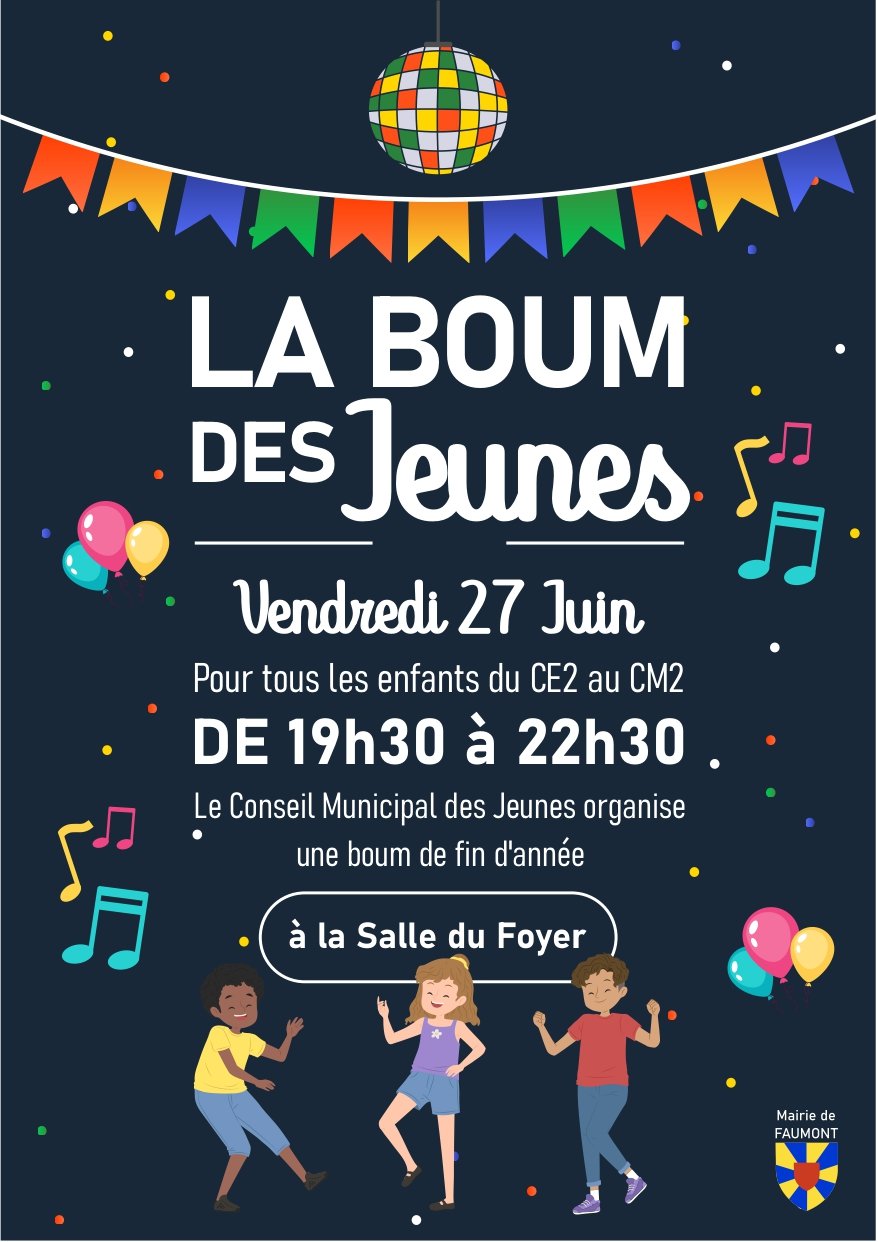 Le Conseil Municipal Jeunes organise la Boum des Jeunes afin de fêter la fin d'année scolaire, dans la Salle du Foyer, le Vendredi 27 Juin 2025 de 19h30 à 22h30.