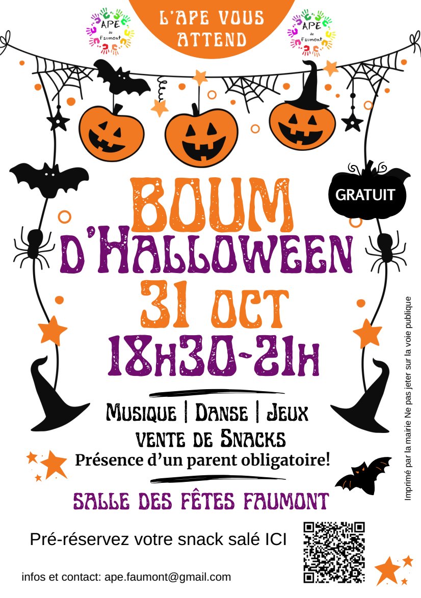 đ Ne manquez pas cette soirĂ©e festive et conviviale, organisĂ©e par lâAPE pour cĂ©lĂ©brer Halloween tous ensemble. LâentrĂ©e est libre et ouverte Ă tous les enfants de Faumont et leurs familles.