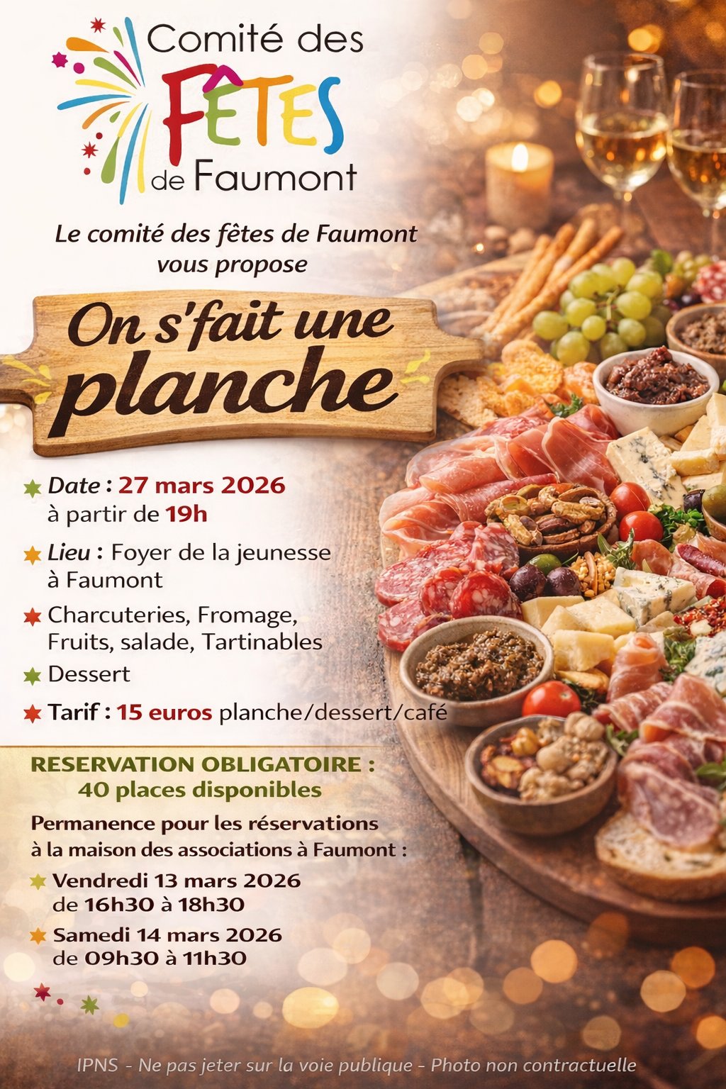 AprĂšs un premier essai rĂ©ussi, Le ComitĂ© des fĂȘtes de Faumont vous invite Ă nouveau Ă Â participer Ă une soirĂ©e placĂ©e sous le signe du partage et de la gourmandise. IntitulĂ©e « On sâfait une planche !!! », cette soirĂ©e repas se tiendra le vendredi 27 mars 2026 Ă partir de 19h, au Foyer de la jeunesse de Faumont.