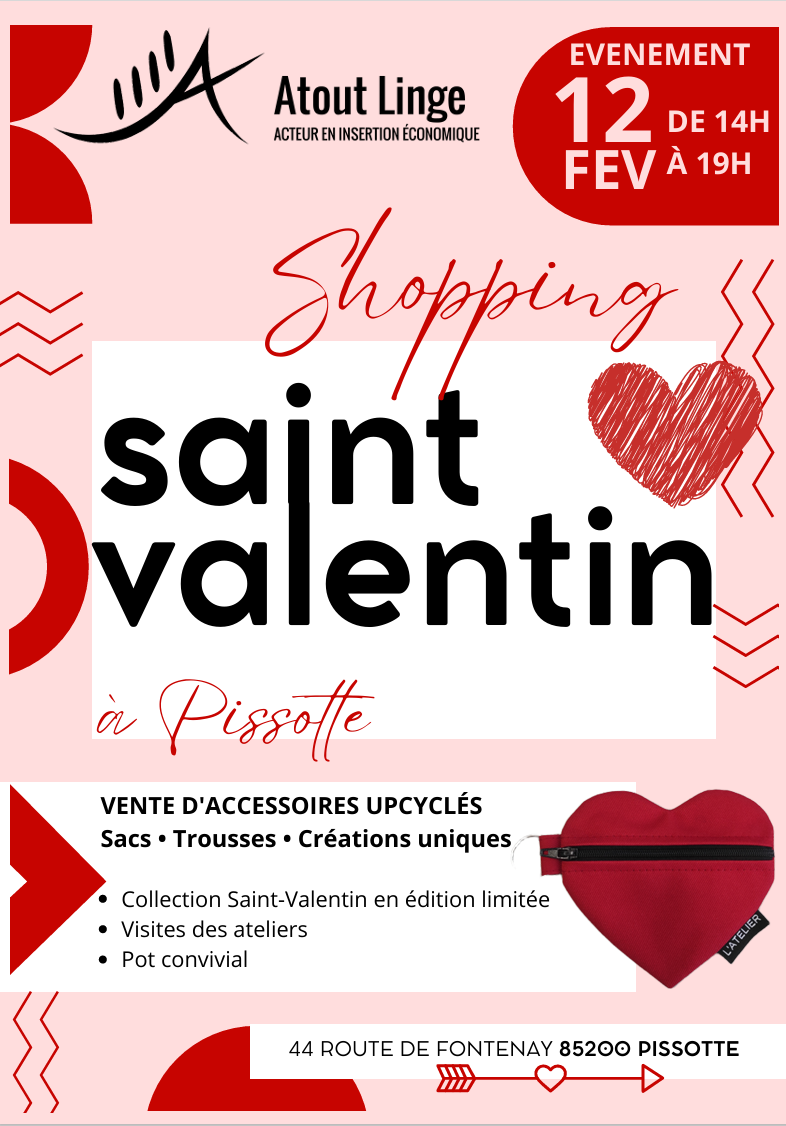 Nous avons le plaisir de vous convier au « Shopping Saint Valentin », qui se déroulera le 12 février 2026, de 14h00 à 19h00, dans nos locaux situés au 44 route de Fontenay, à Pissotte.