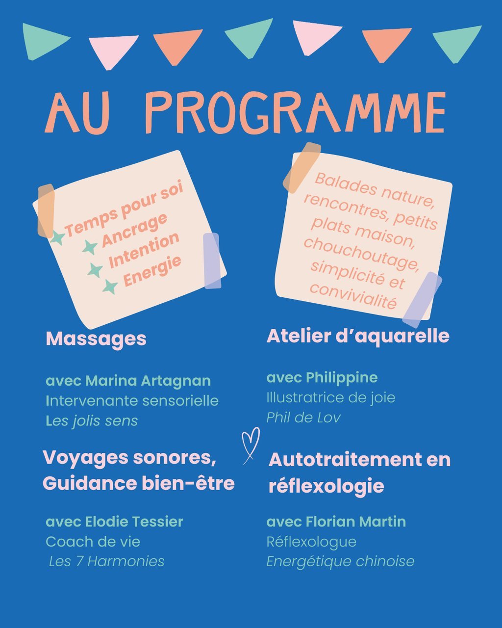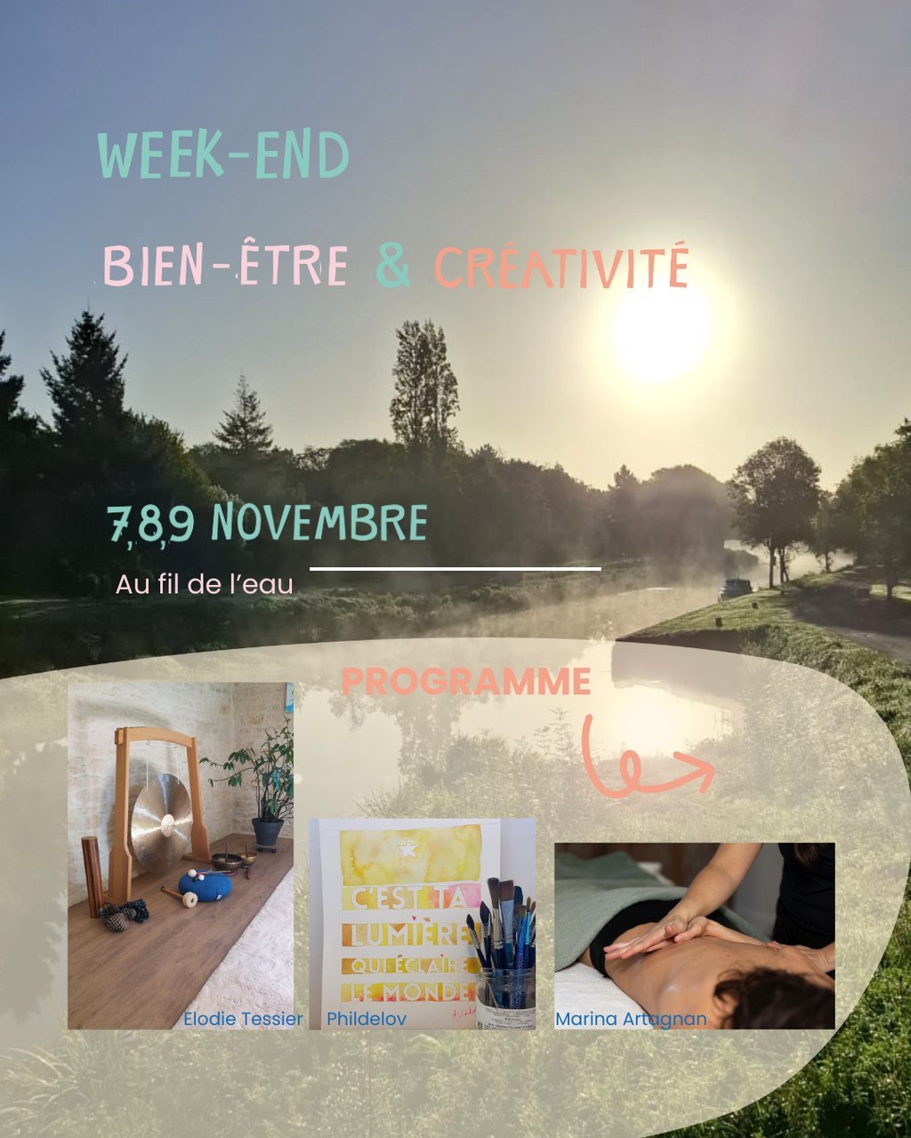 Au programme : voyages sonores, massage, atelier d'aquarelle, atelier de réflexologie, méditations guidées... hébergement sur le bord du canal de Nantes à Brest et petits plats maison, bio et locaux !