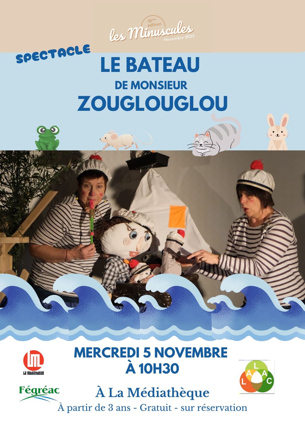 Dans le cadre du festival Les Minuscules, rendez-vous culturel pour les enfants et leurs parents, la médiathèque accueille le spectacle Le bateau de Monsieur Zouglouglou, inspiré de l’album jeunesse du même nom.