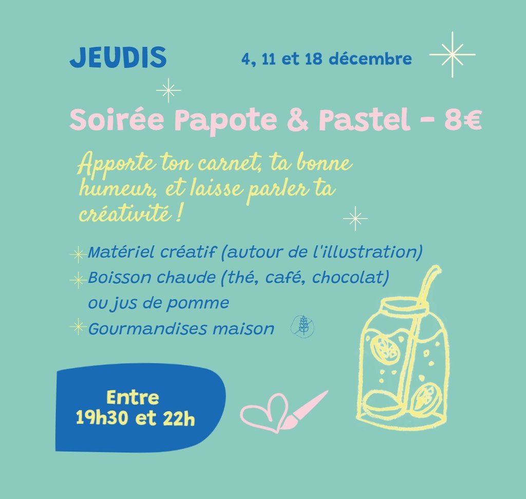 Le tarif comprend boisson, gourmandise et matériel créatif mais tu peux aussi apporter tes pinceaux et crayons préférés !
