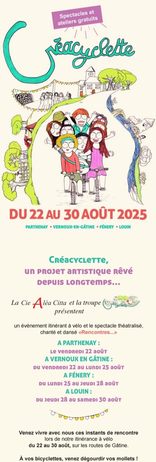 La troupe Créacyclette va faire escale durant 4 jours sur la commune de Fénery avec des spectacles et ateliers gratuits 🎭🖌️🚲🍴💃🪩🎥