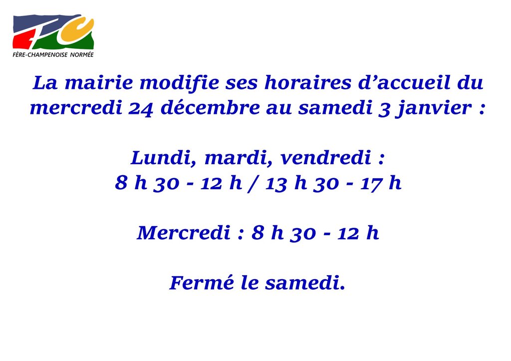Modification des horaires d'ouverture de la mairie entre le 24 décembre et le 3 janvier.
