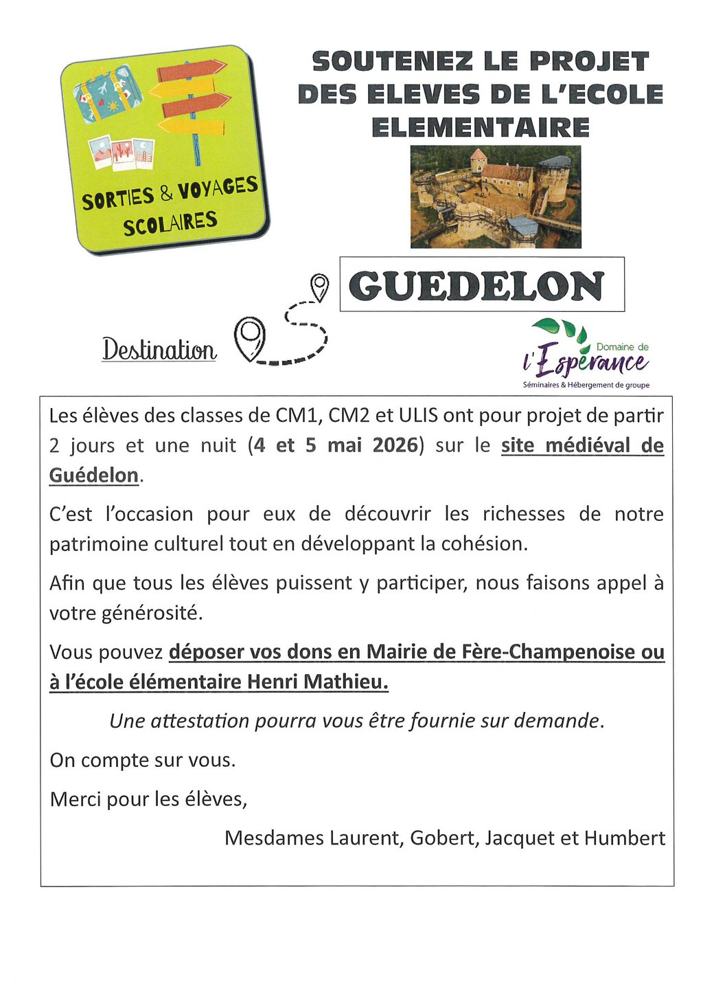 N'hésitez pas à apporter votre aide aux élèves de l'école élémentaire pour leur projet "Guédelon" !