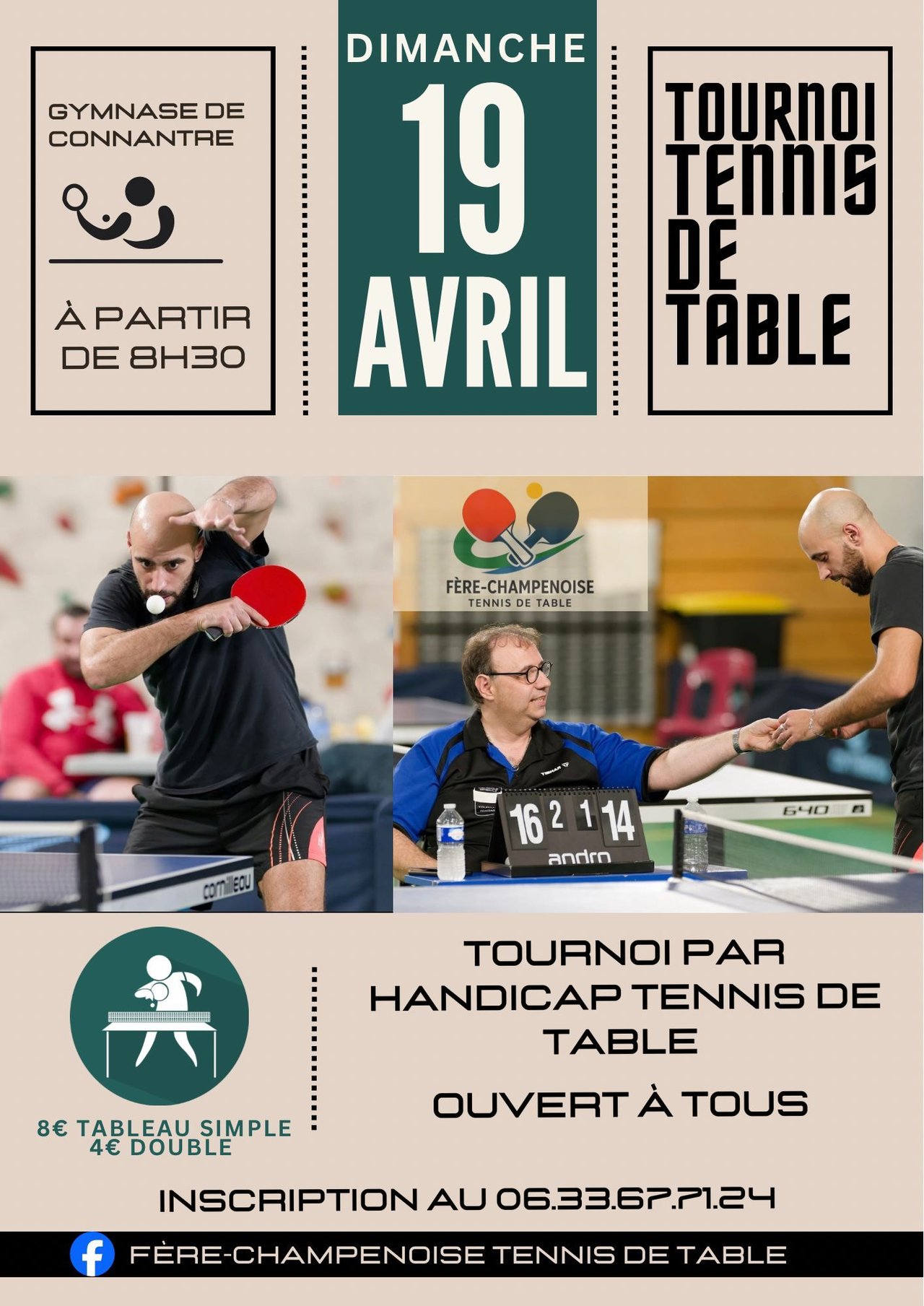 Comme chaque année, et en concertation, nous organisons le tournoi amical de tennis de table de Fère-Champenoise qui se déroulera le 19 Avril 2026 au Gymnase de Connantre.