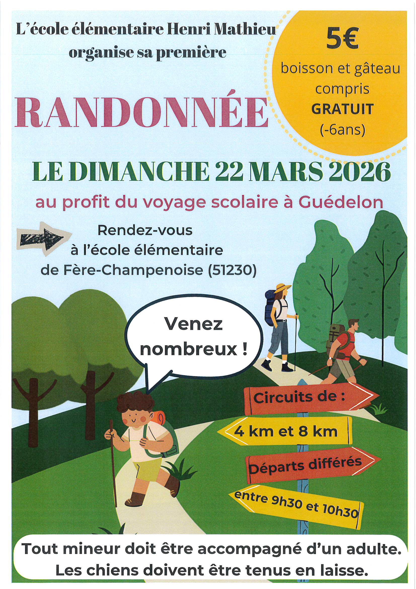 Dimanche 22 mars 2026, les classes de Mmes Gobert, Humbert, Jacquet et Laurent organisent une randonnée au profit de leur voyage scolaire à Guédelon les 04 et 05 mai 2026.
