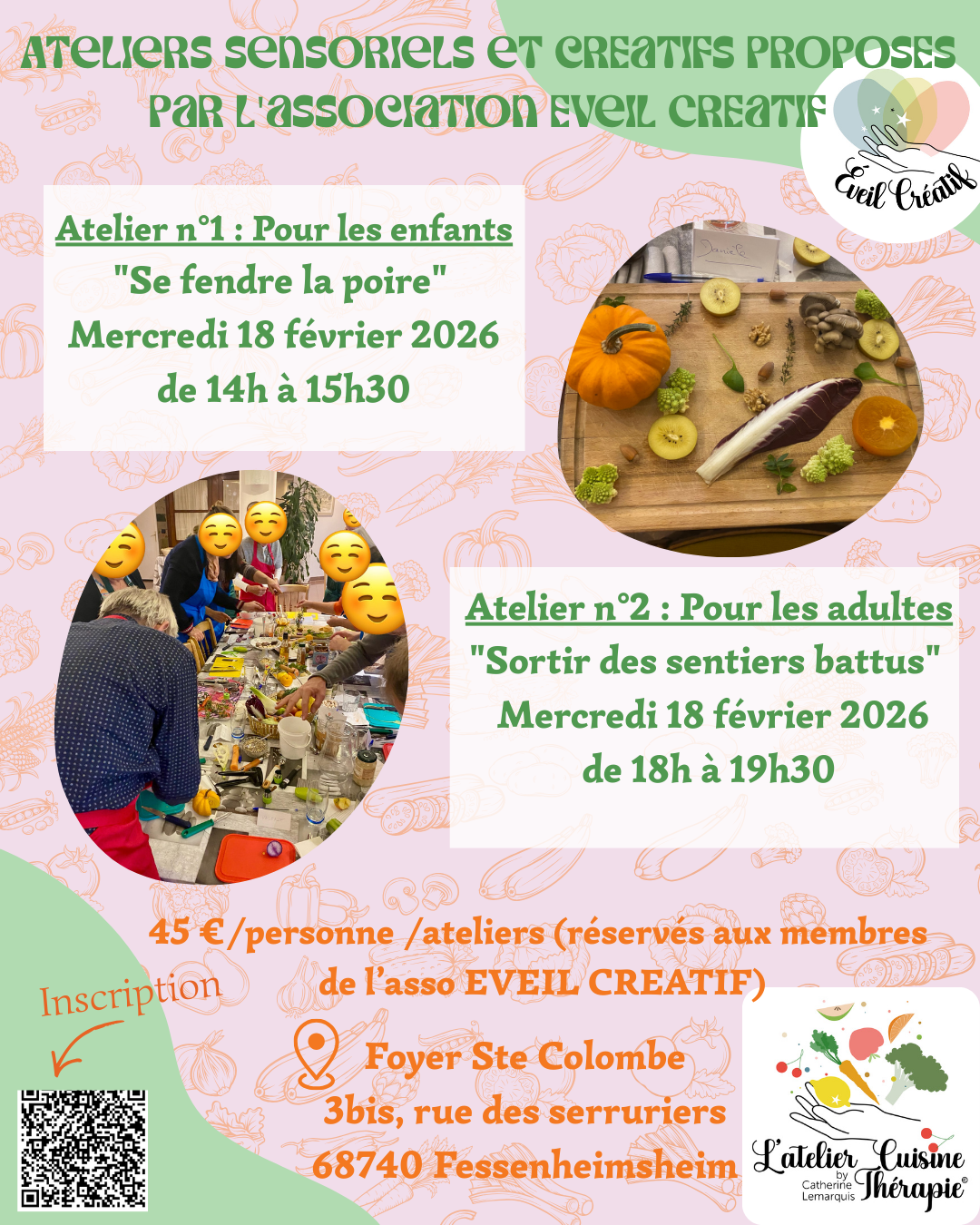 - Soit sur Helloasso pour payer en ligne avec le QR code sur les affiches ou le lien suivant : https://www.helloasso.com/associations/association-eveil-creatif/evenements/inscription-atelier-duo-parent-enfant-d-imporvisation-culinaire