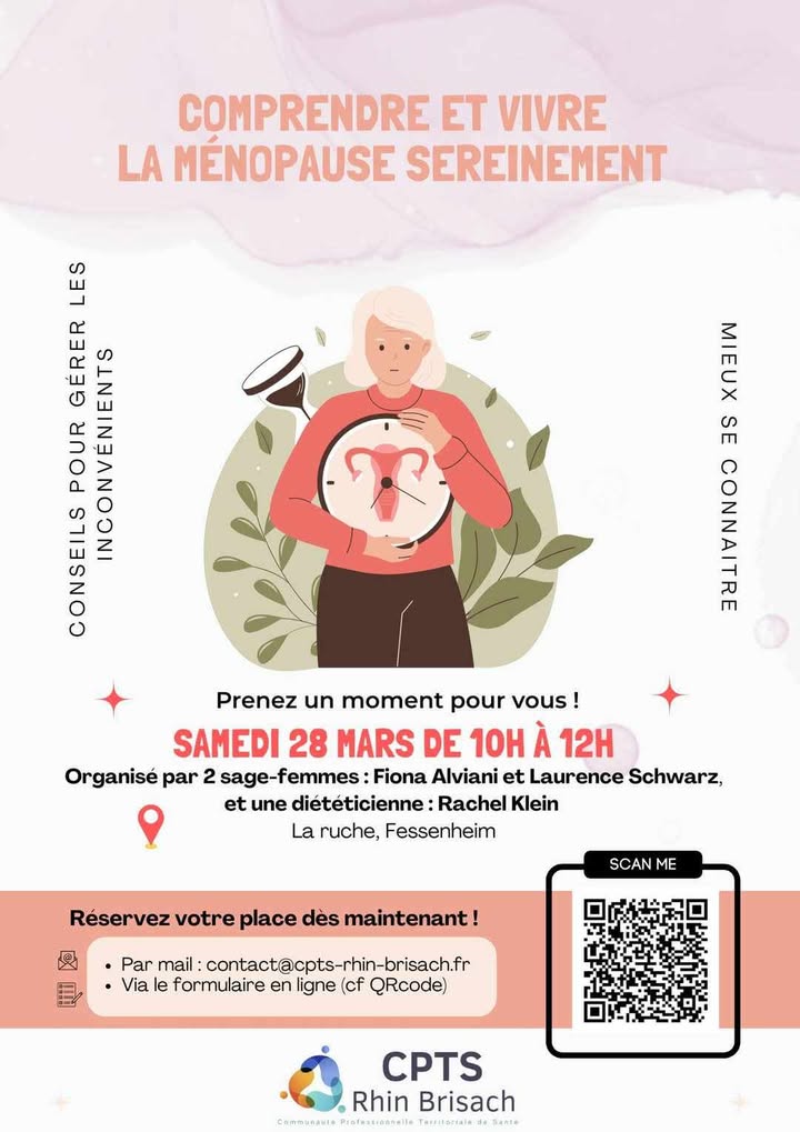 Deux sages-femmes, Fiona Alviani et Laurence Schwartz et une diététicienne, Rachel Klein, propose une rencontre sur le thème de la ménopause. Elles donneront des conseils pour gérer les inconvénients, mieux se connaître, vivre la ménopause sereinement.