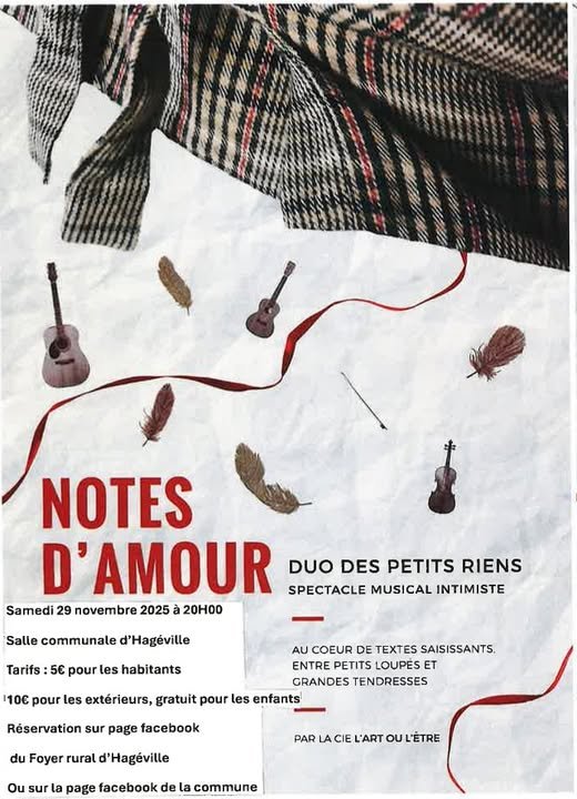 Dernier spectacle de l'année. Retenez toutes et tous cette date : samedi 29 novembre à 20H00 dans la salle communale. Nous recevrons un Duo de soeurs-chanteuses et musiciennes : Camille et Emilie. Pour des chansons françaises de qualité : entre émotions et tendresse. De toutes époques, des années 60 à nos jours. De Barbara à Gainsbourg en passant par Zazie ou Pomme. Camille et Emilie font partie de la Compagnie " L'art ou l'être " belle communauté de musiciens professionnels. Soirée de qualité à retenir. 5 € l'entrée pour les membres du foyer. 10 € pour les extérieurs. Gratuit pour les jeunes. Réservations sur la page FB du Foyer Rural d'Hagéville ou sur la page FB de la commune. Nous vous attendons en nombre pour cette dernière de l'année.