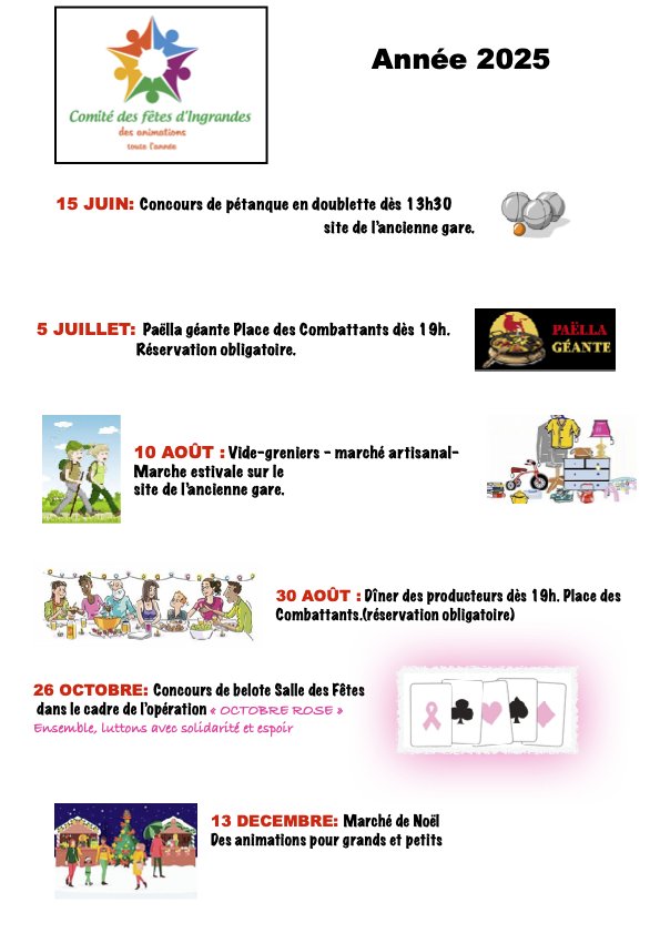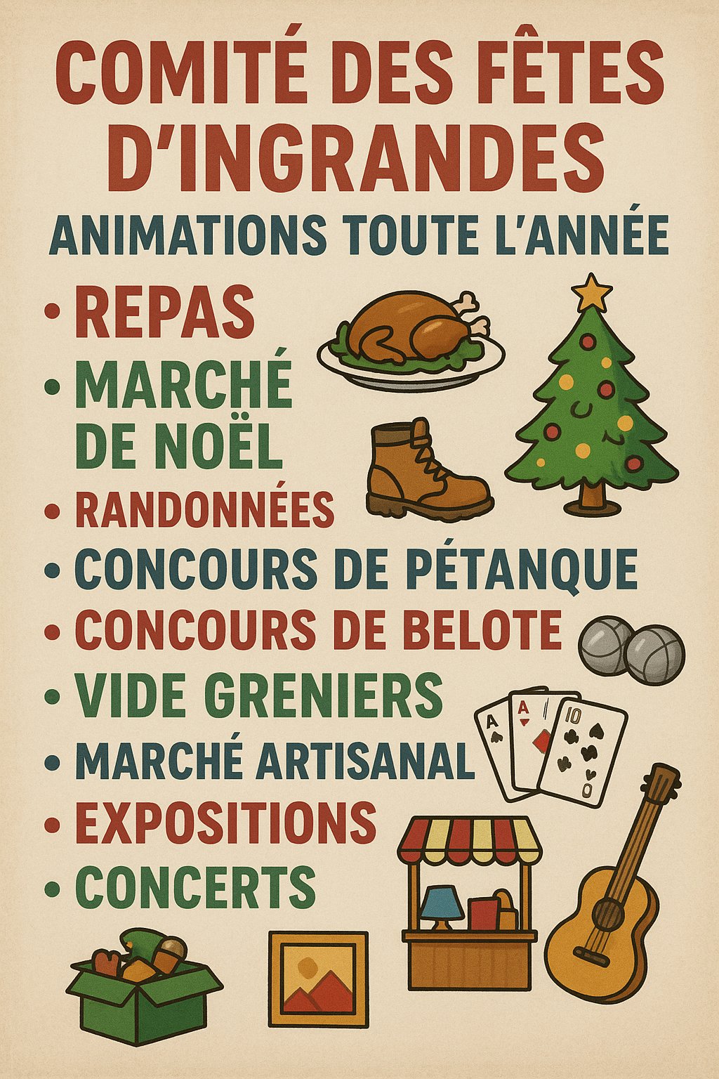 brocantes - concours de pétanque - expositions d'art et d'artisanat - concours de belote -repas - marché de Noël...