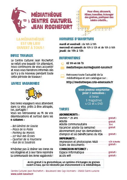 Lieu de rencontre et de partage situé dans la cour du centre culturel Jean Rochefort, la médiathèque participe au dynamisme de la vie de la commune. Pour rêver, découvrir, flâner ou travailler, l’équipe de la médiathèque, composée d’une professionnelle et de bénévoles passionnés, ouvre ses portes à tous, des bébés aux seniors. Vous y trouverez magazines, livres, films, livres audio et musique. Ses collections sont régulièrement enrichies par la MDIV (médiathèque départementale d’Ille-et-Vilaine).
