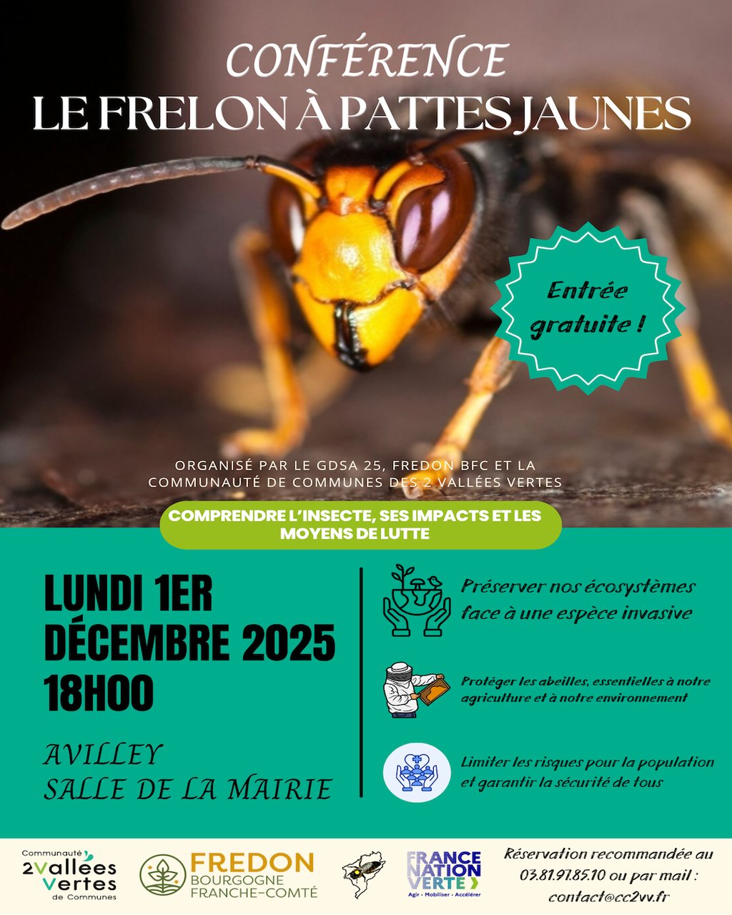 La CC2VV, en partenariat avec FREDON BFC et le GDSA 25, organise une conférence sur le frelon à pattes jaunes le lundi 1er décembre à 18h00 à la salle de la Mairie.