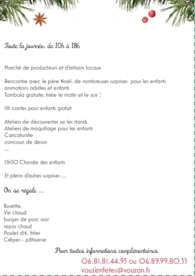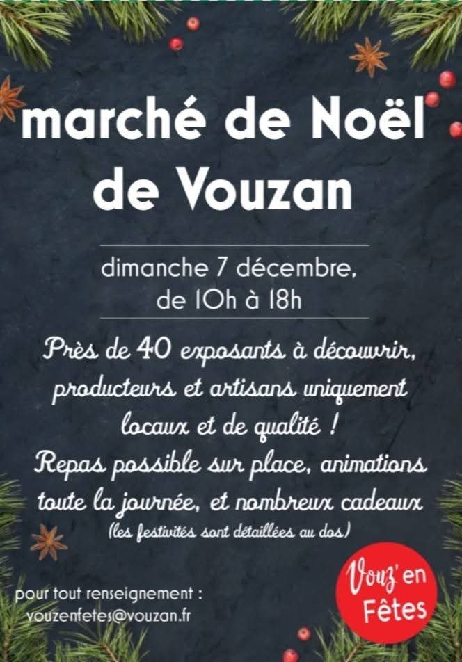 Rendez-vous à la salle des fêtes le dimanche 7 décembre à partir de 10H pour le traditionnel marché de Noël organisé par l'association Vouz'en fêtes.