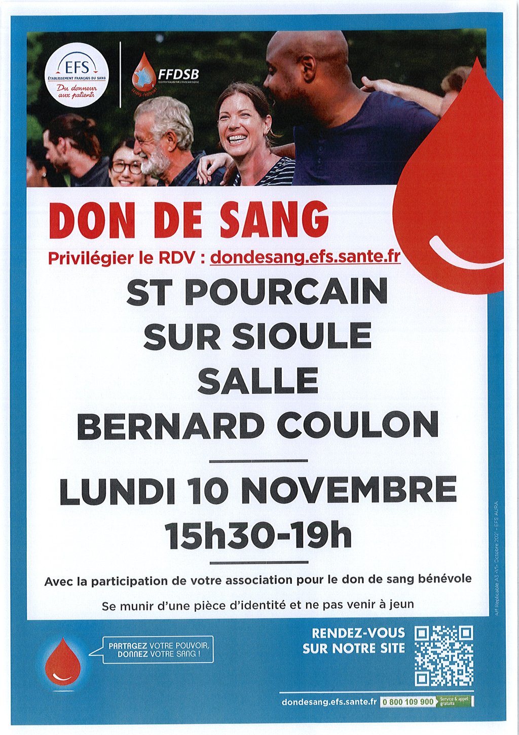 Saint Pourçain sur SIoule le lundi 10 novembre 2025, salle Bernard Coulon de 15h30 à 19 heures