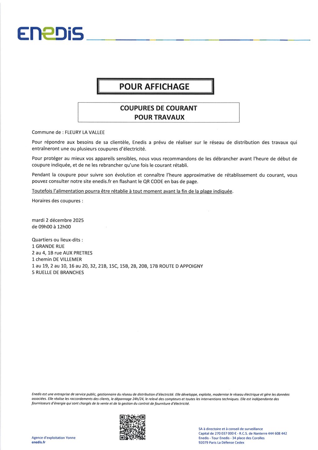 ENEDIS - COUPURES DE COURANT POUR TRAVAUX MARDI 2 DECEMBRE 2025