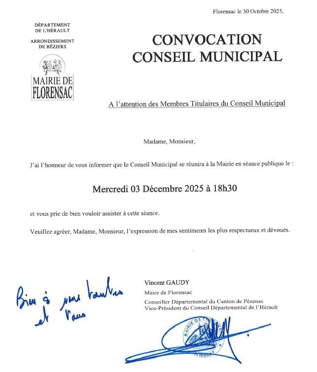 Le conseil Municipal se réunira en Mairie en séance publique le mercredi 03 décembre 2025, à 18h30.
