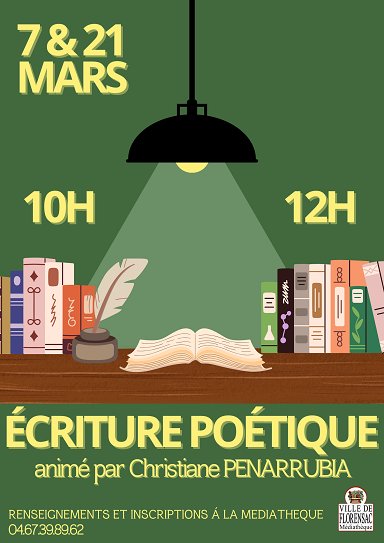 Atelier d'écriture poétique animé par Christiane Penarrubia, le 7 mars à 10h à la médiathèque de Florensac.