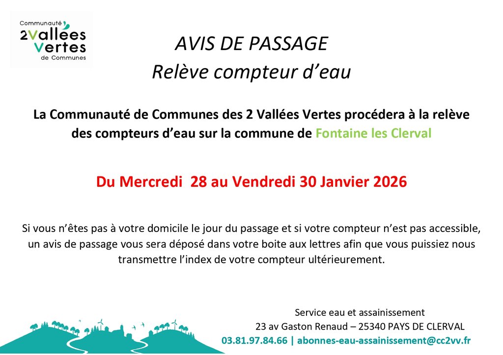 La relève des compteurs d’eau aura lieu du mercredi 28 au vendredi 30 janvier 2026 sur la commune de Fontaine-lès-Clerval.