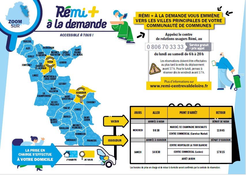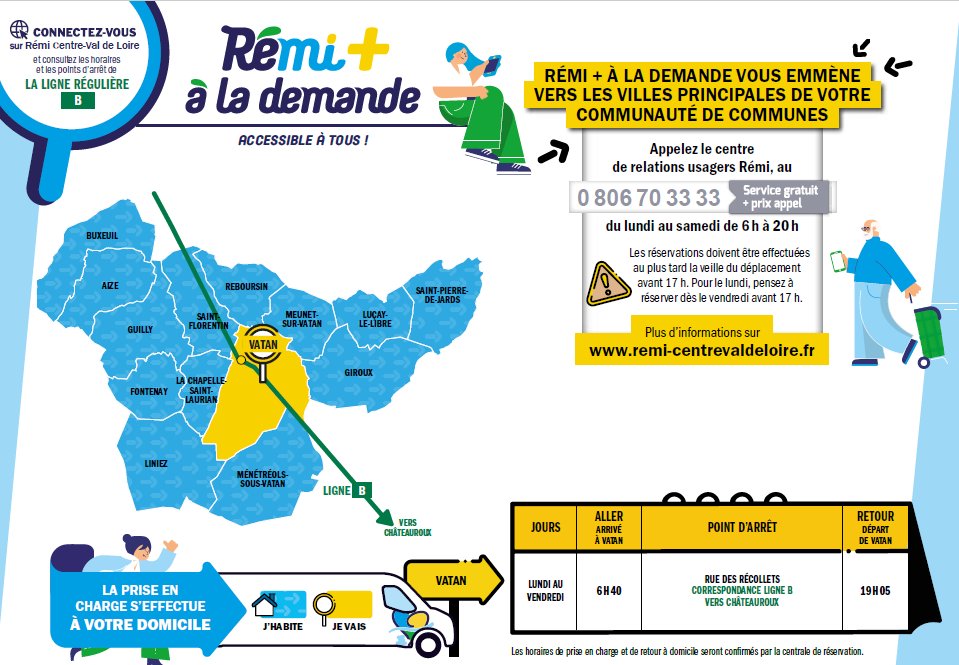 En septembre 2024, la Région Centre-Val de Loire, autorité organisatrice de la mobilité, a fait évoluer son offre de transport REMI avec notamment un nouveau réseau de lignes régulières proposant des tracés plus directs, davantage de services sans réservation préalable, plus de fréquences, ainsi que des véhicules progressivement renouvelés et mieux équipés pour le confort des voyageurs.