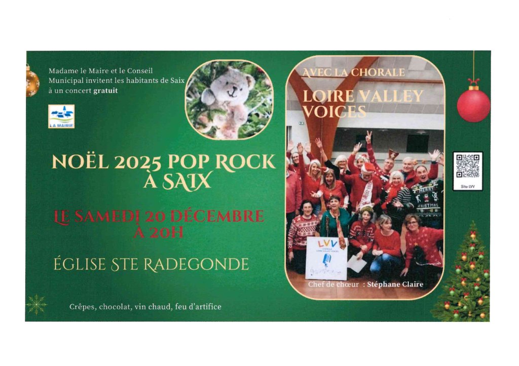 A l'occasion de ses traditionnelles animations de Noël, la municipalité de Saix invite la chorale bilingue LOIRE VALLEY VOICES pour un programme original qui mélangera chants de Noël et répertoire pop-rock-soul, le samedi 20 décembre 2025 à 20h.