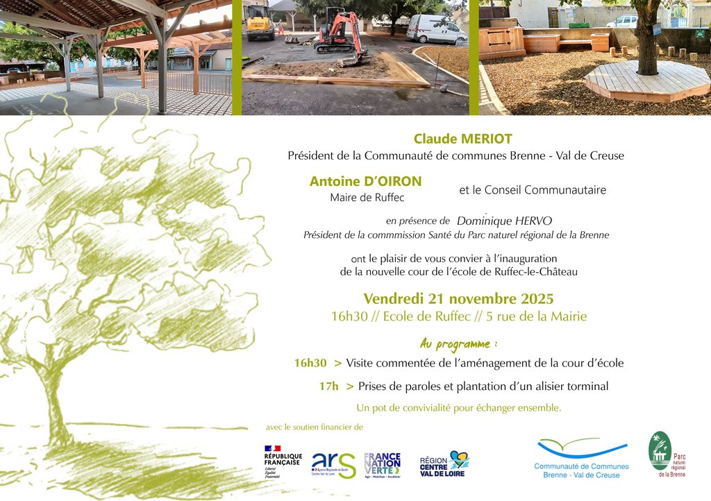 Nous avons le plaisir de vous inviter à l'inauguration de la cour de l'école de Ruffec, un projet conçu pour améliorer le bien-être des enfants au quotidien. Grâce à un soutien de l’État (ARS Centre-Val de Loire / Fonds vert) de la Région centre-Val de Loire (à travers son Contrat Régional de Solidarité Territoriale), la Communauté de communes Brenne-Val de Creuse et le Parc naturel régional de la Brenne se sont associées pour penser cette transformation de manière répondre à plusieurs enjeux liés à l'environnement, à la santé des plus jeunes et à la diversification des usages de la cour.