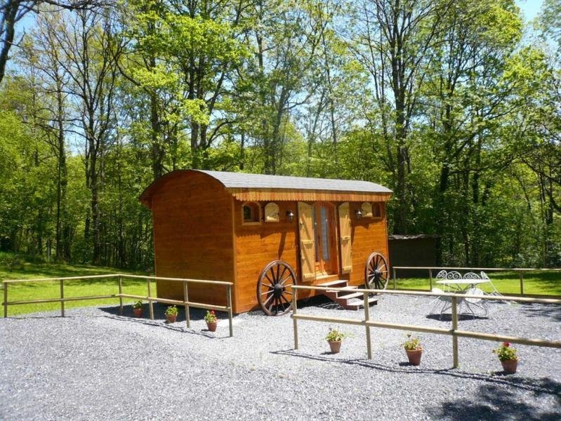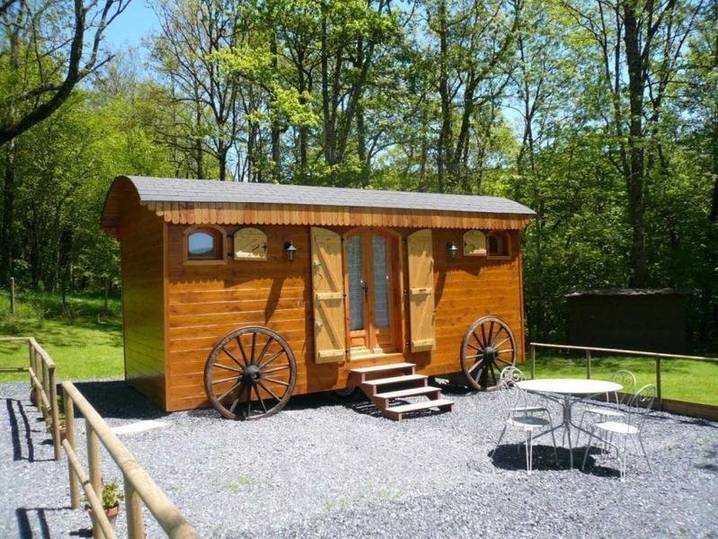 La roulotte se tient au milieu d'une clairière, ne craignez pas d'y être à l'étroit car elle est spacieuse et confortable, l’aménagement optimise chaque espace. En bois massif, elle est aménagée de plain-pied et pensée comme une petite maison fonctionnelle. La pièce de vie regroupe un coin salon chaleureux et une cuisine bien équipée. Une salle d'eau complète l'ensemble, avec WC.