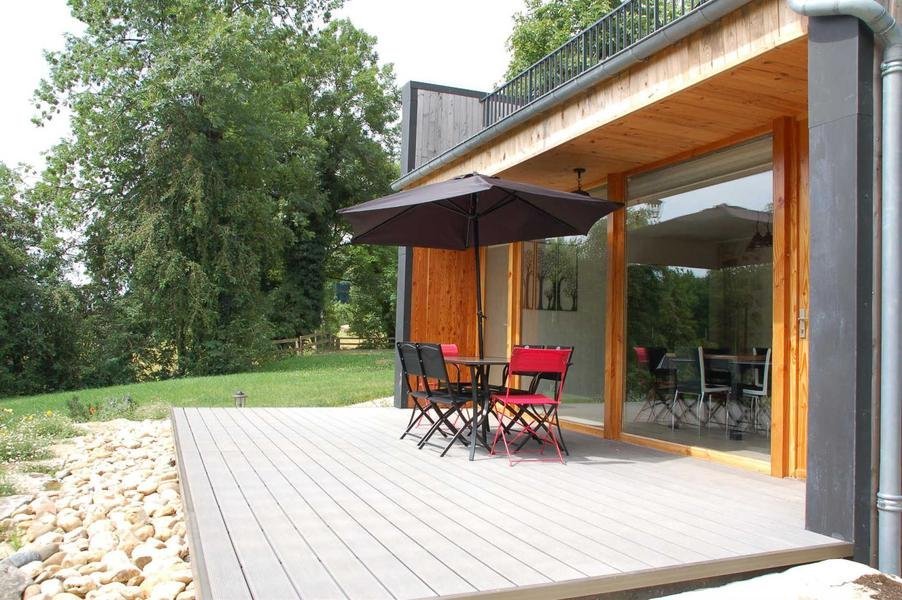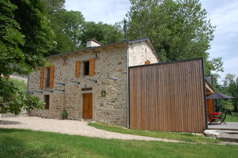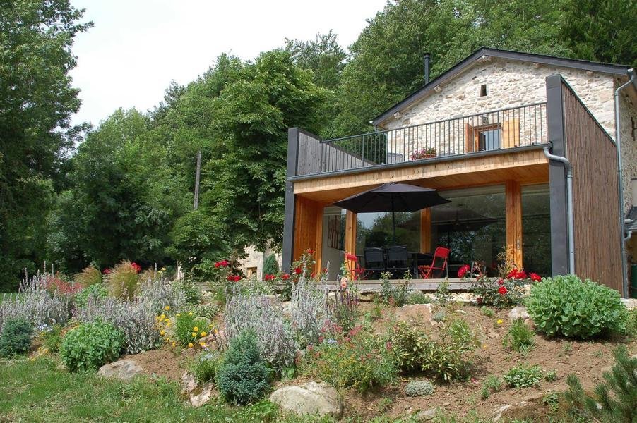 Mélange réussi entre éléments patrimoniaux (potager et évier en pierre, four à pain) et extension contemporaine. Belle terrasse en bois, jardin.