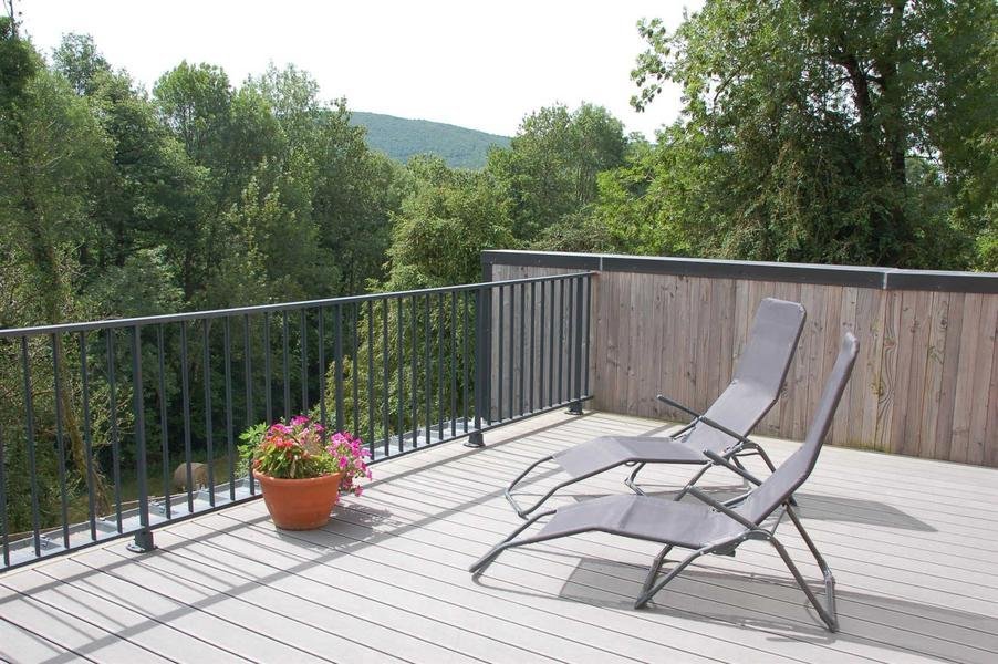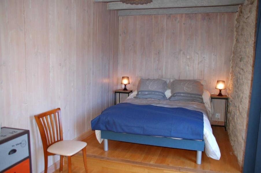 A l'étage, deux chambres, salle d'eau, wc séparé. Terrasse suspendue. Chauffage (inclus dans le prix ) par un poêle à granulés, poêle à bois, complémenté avec radiateurs électriques.