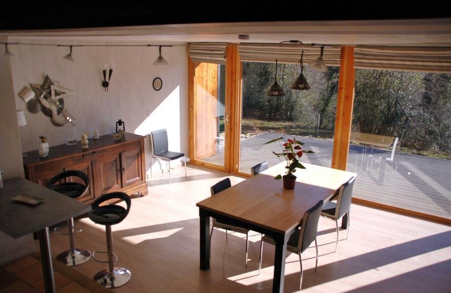 Grand séjour avec cuisine ouverte moderne et toute équipée, salon en rez-de-chaussée.