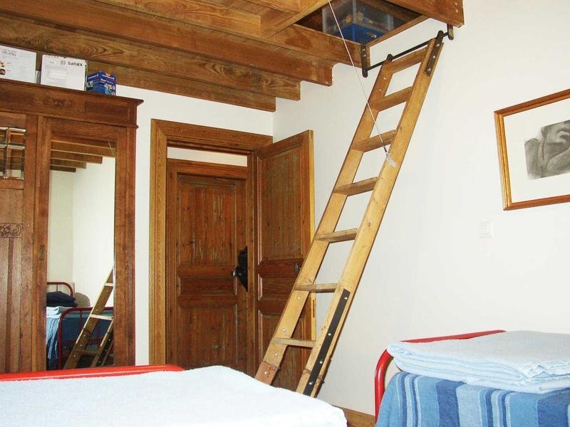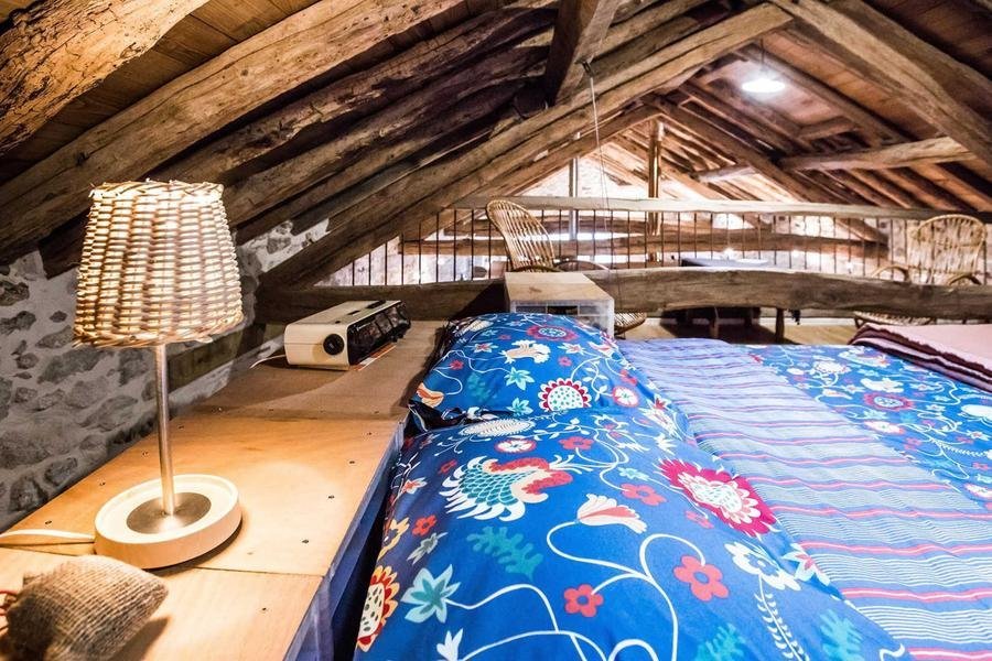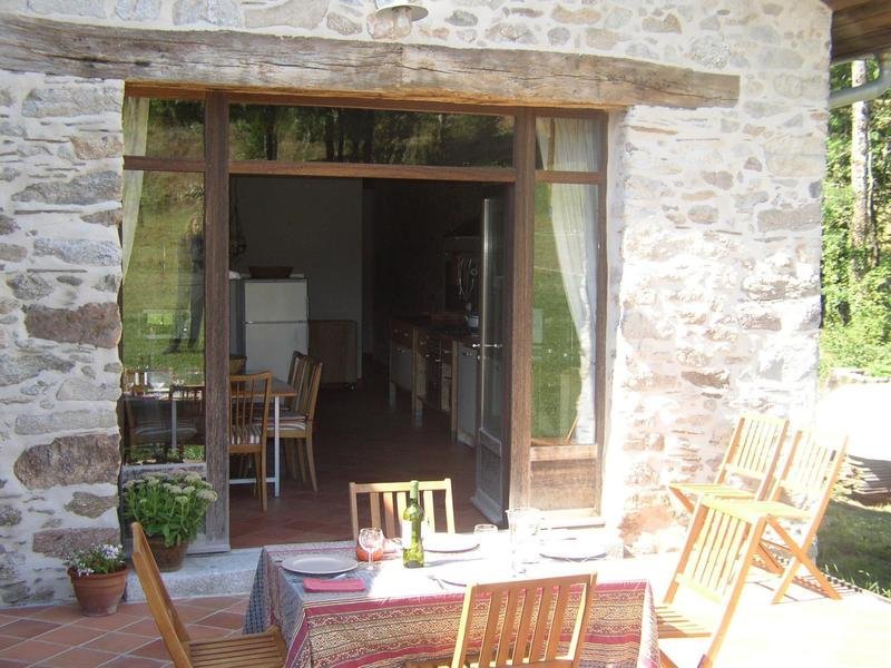 Gîte à l'étage d'un côté (escalier métallique), en rez-de-jardin de l'autre (terrasse). Pièce à vivre avec cuisine ouverte toute équipée, deux chambres, salle d'eau, wc. La troisième chambre est en mezzanine sous les toits, accessible par une échelle depuis la seconde chambre. Poêle à bois.