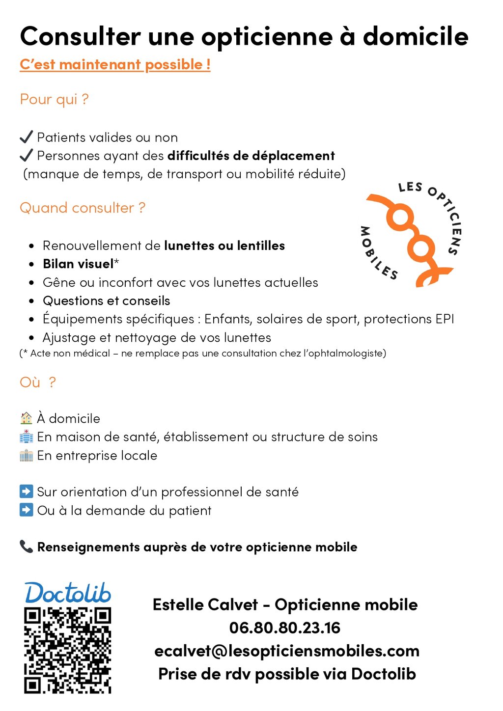 L'offre de santé s'étoffe ! Estelle Calvet, opticienne mobile, intervient désormais à domicile, en entreprise ou en maison de santé pour faciliter votre accès aux soins visuels.