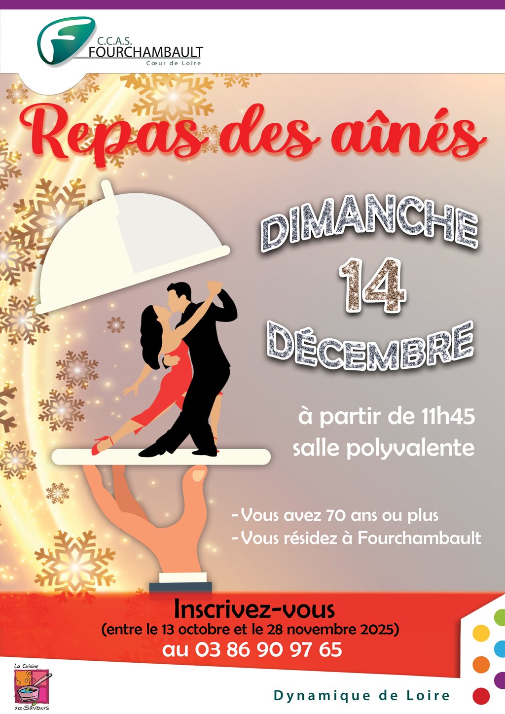 Le repas aura lieu le dimanche 14 décembre 2025 à la salle polyvalente Marcel Paul de Fourchambault. Il sera précédé d’un vin d’honneur qui sera servi à partir de 11h45, en présence des Elus de la Commune et du CCAS.